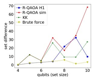 The results (see figure below) showed the performance of the H1 to be competitive with a simulator incorporating only shot noise resulting from the finite number of measurements. On the algorithmic side, for the small problem instances studied, the depth-1 R-QAOA has a performance that is comparable to the classical Karmarkar-Karp (KK) heuristic. Future work will explore whether higher-depth versions of R-QAOA are able to outperform the KK algorithm.