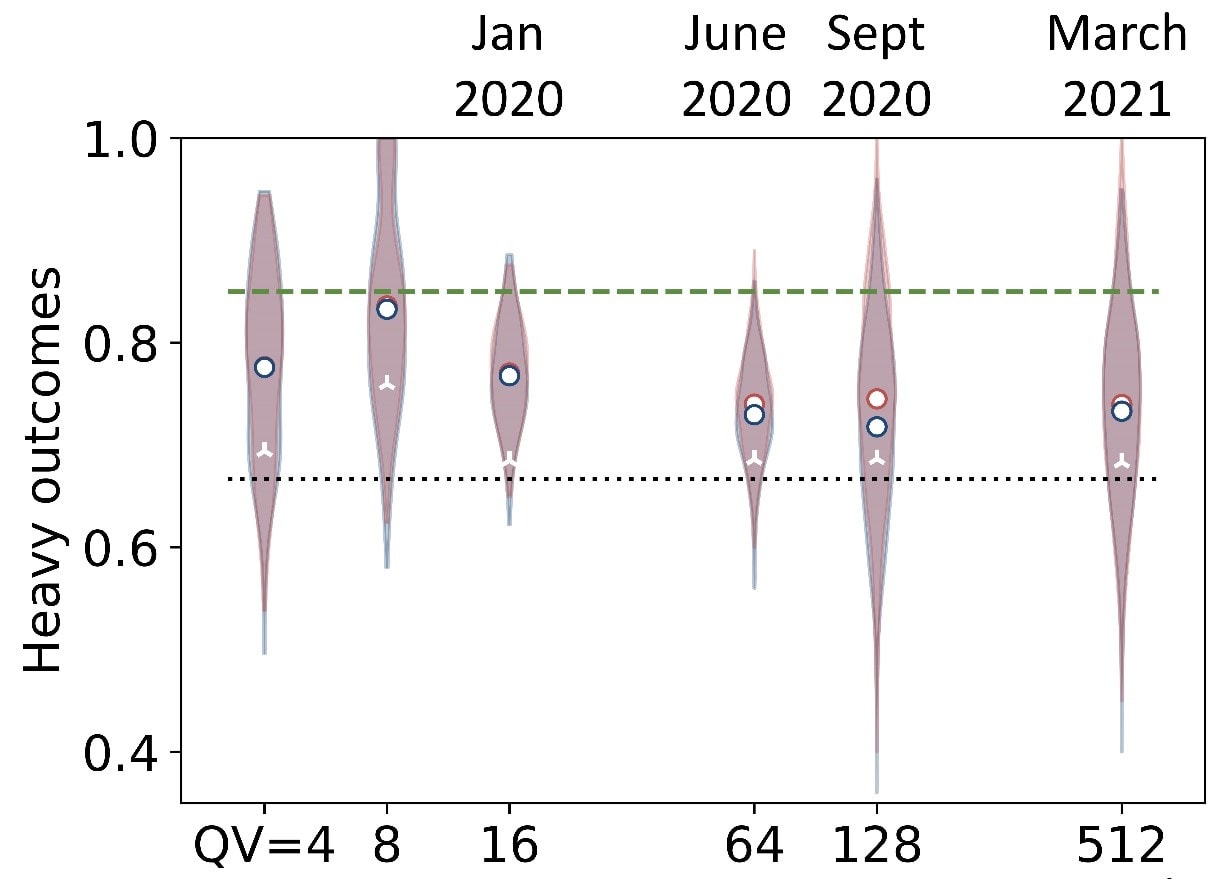 The plot above shows the heavy outcomes for Honeywell Quantum Solutions’ tests of quantum volume and the dates when each test passed. All tests are above the 2/3 threshold to pass the respective Quantum Volume. Circles indicate heavy outcome averages and the violin plots show the histogram distributions. Data colored in blue show system performance results and red show modeled, noise-included simulation data. White markers are the lower 2-sigma error bounds.